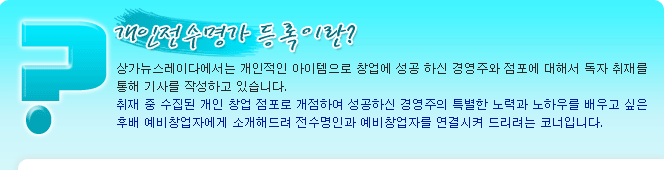 °³ÀÎÀü¼ö¸í°¡ µî·Ï ½ÅûÀº ´ç»ç ȨÆäÀÌÁö ¼º°øÃ¢¾÷ÀÎ Äڳʿ¡ ¼Ò°³µÈ Á¡Æ÷ÁÖ²²¼­ ½ÅûÇÏ½Ç ¼ö ÀÖ½À´Ï´Ù.